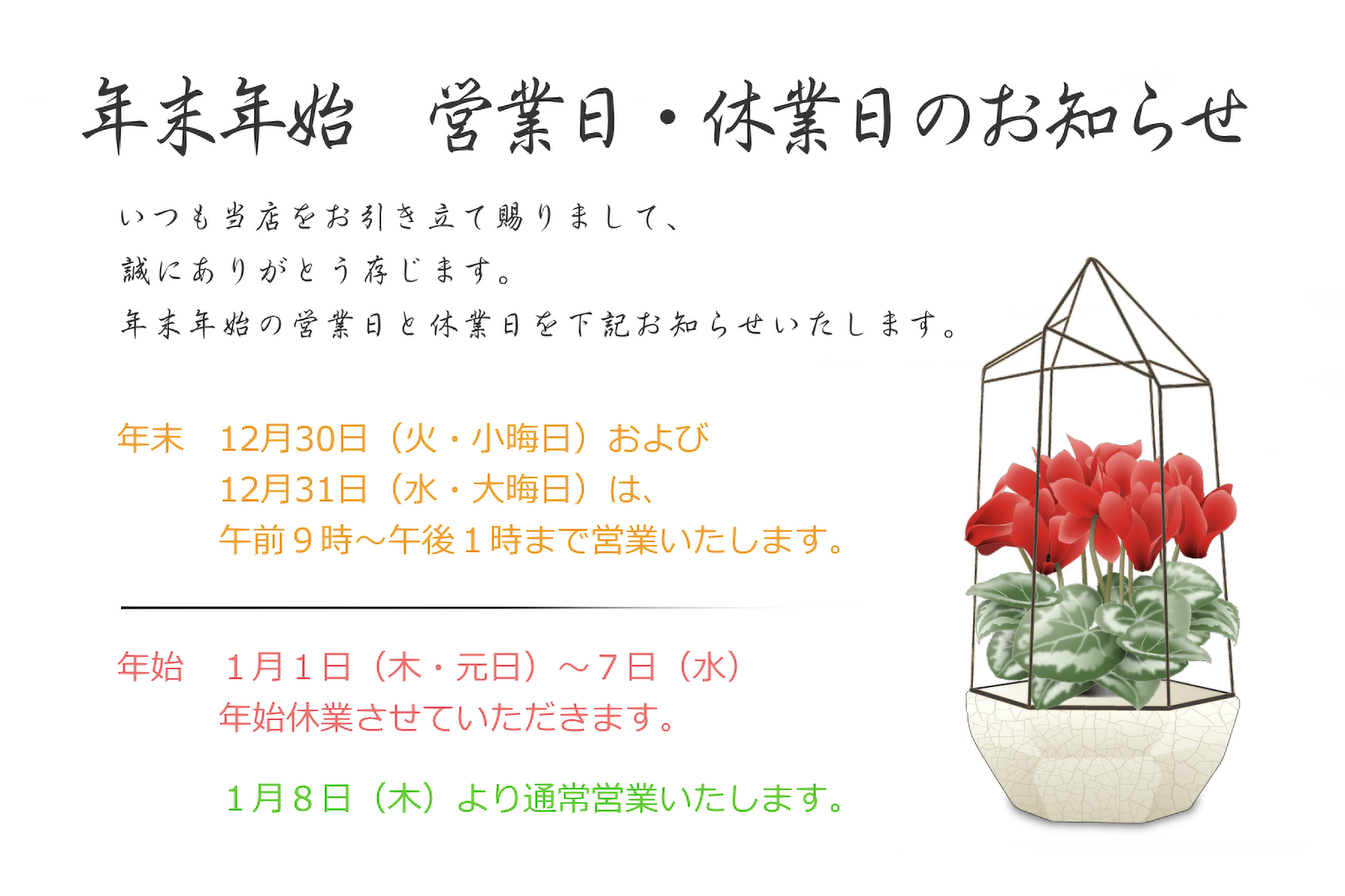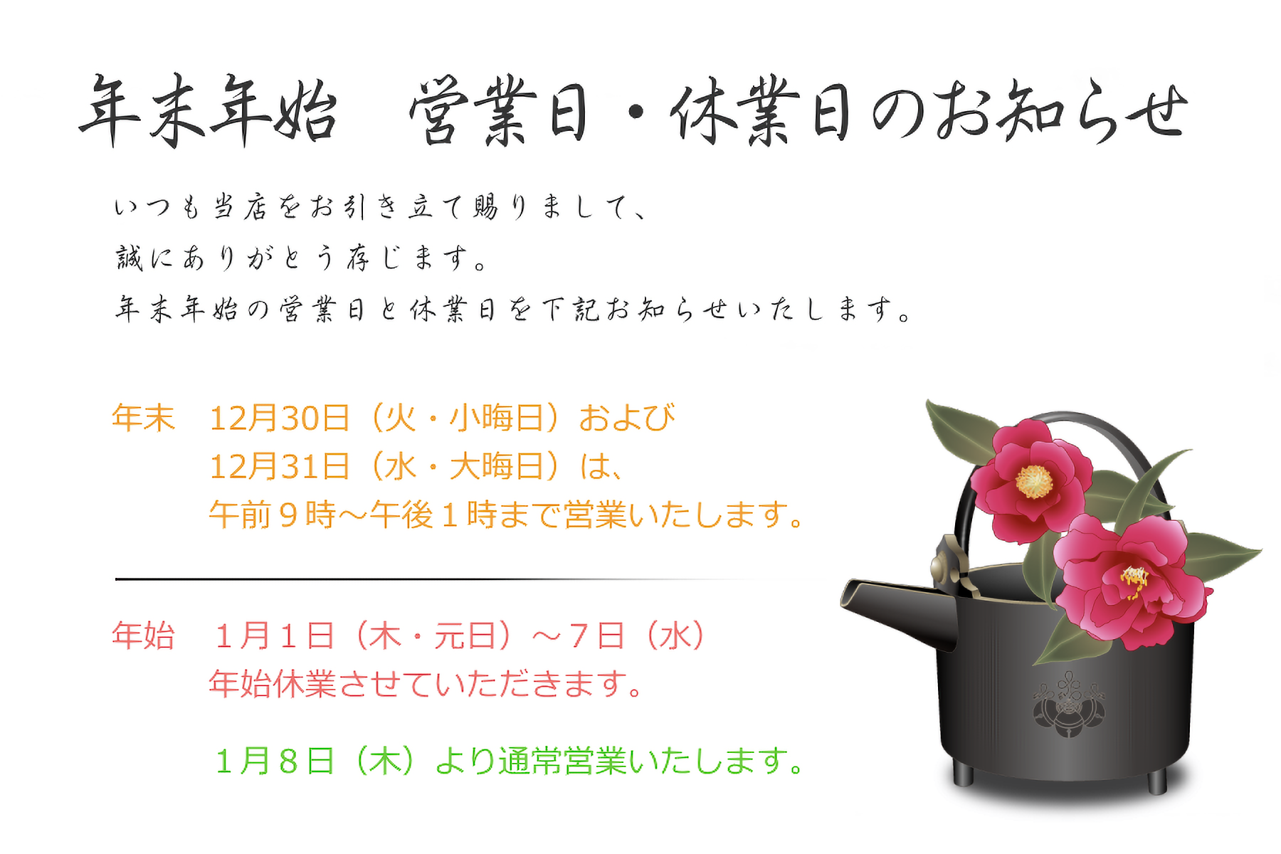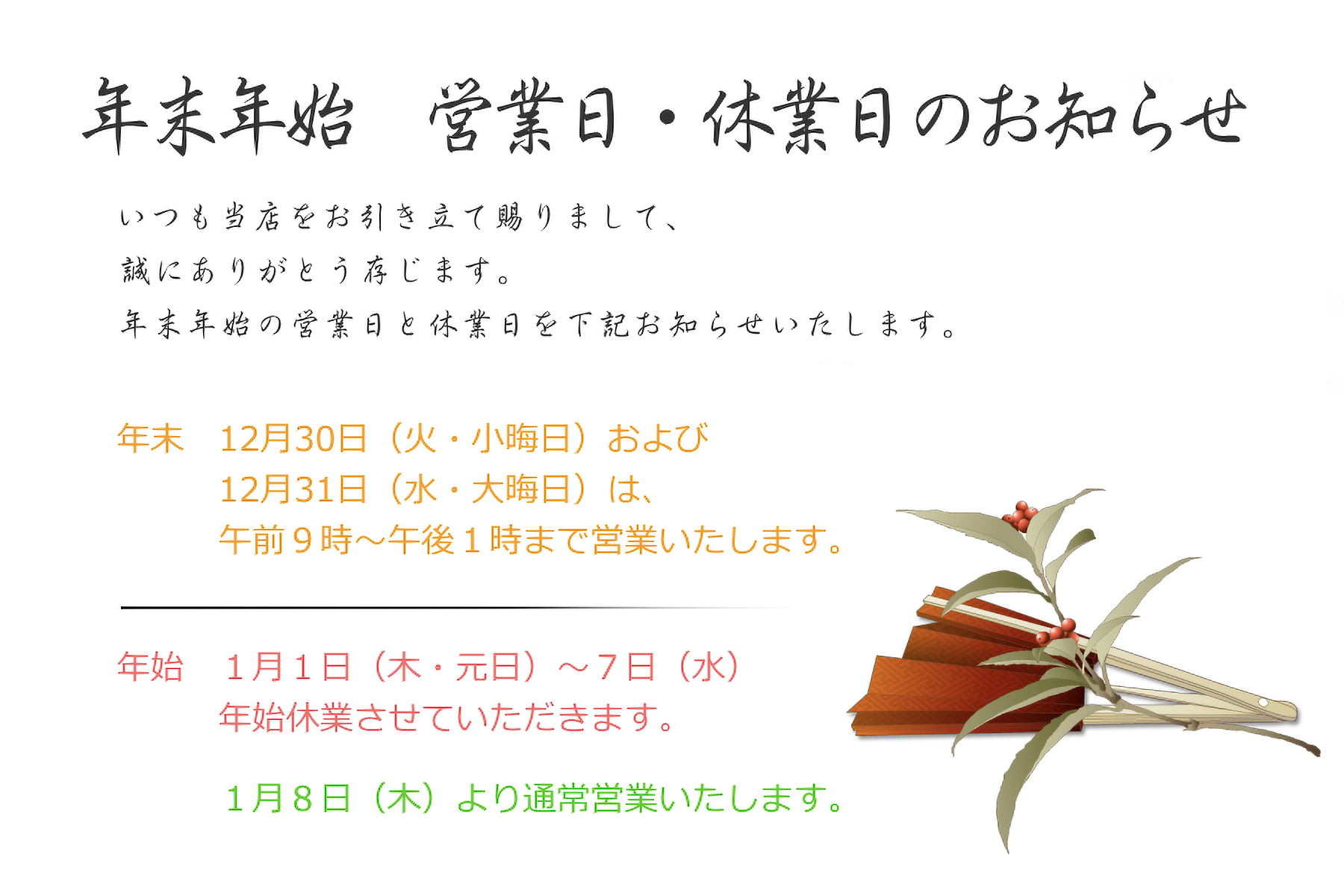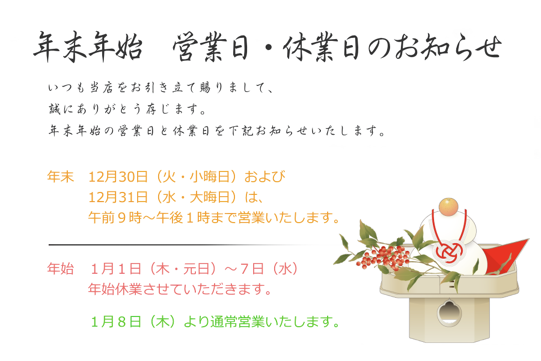 ※30日(火)、31日(水)は営業いたします。(営業時間は午前9時~午後1時までとなります)